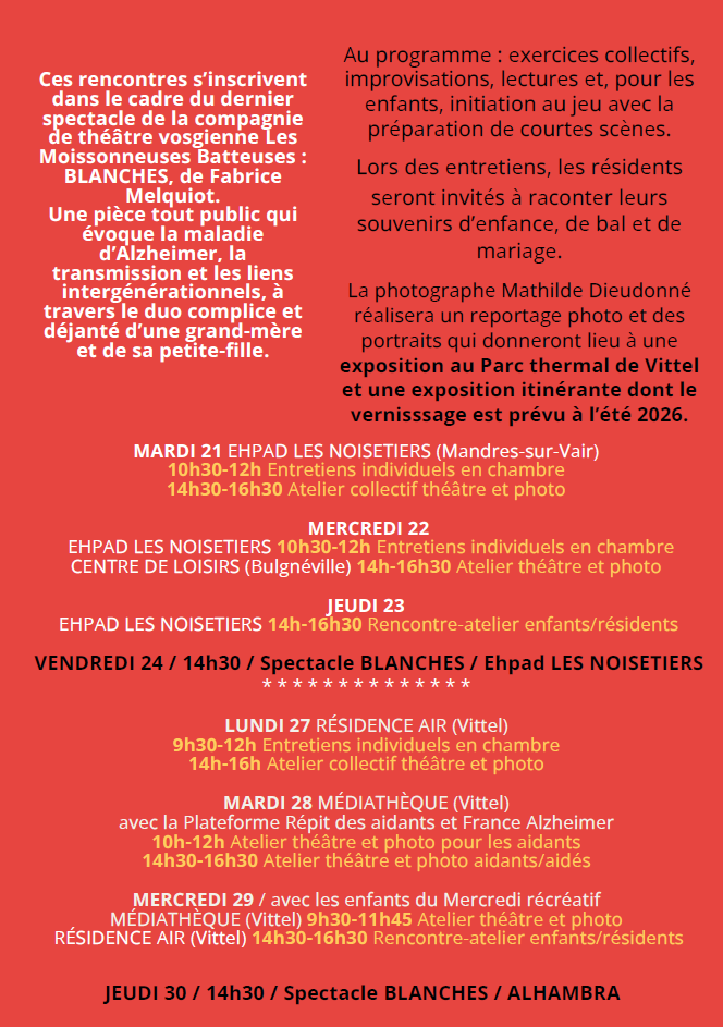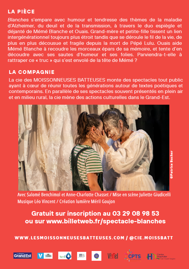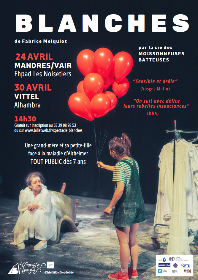 La Communauté de Communes Terre d'Eau, dans le cadre du Contrat Local de Santé et de sa politique culturelle, et la Médiathèque de Vittel, ont élaboré aux côtés de leurs partenaires, une programmation culturelle autour du projet artistique Blanches, mis en scène par la Cie Les Moissonneuses Batteuses, avec pour thématique la maladie d'Alzheimer