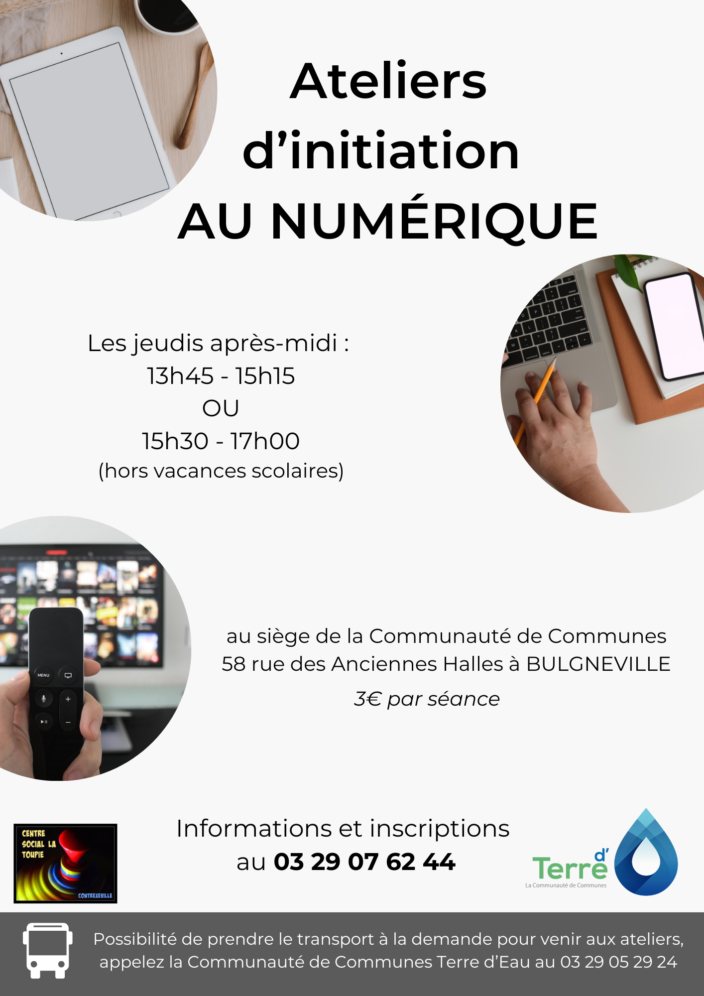 Tarif : participation de 3€ par séance (ateliers financés par la communauté de communes Terre d'Eau) + adhésion annuelle au centre social La Toupie